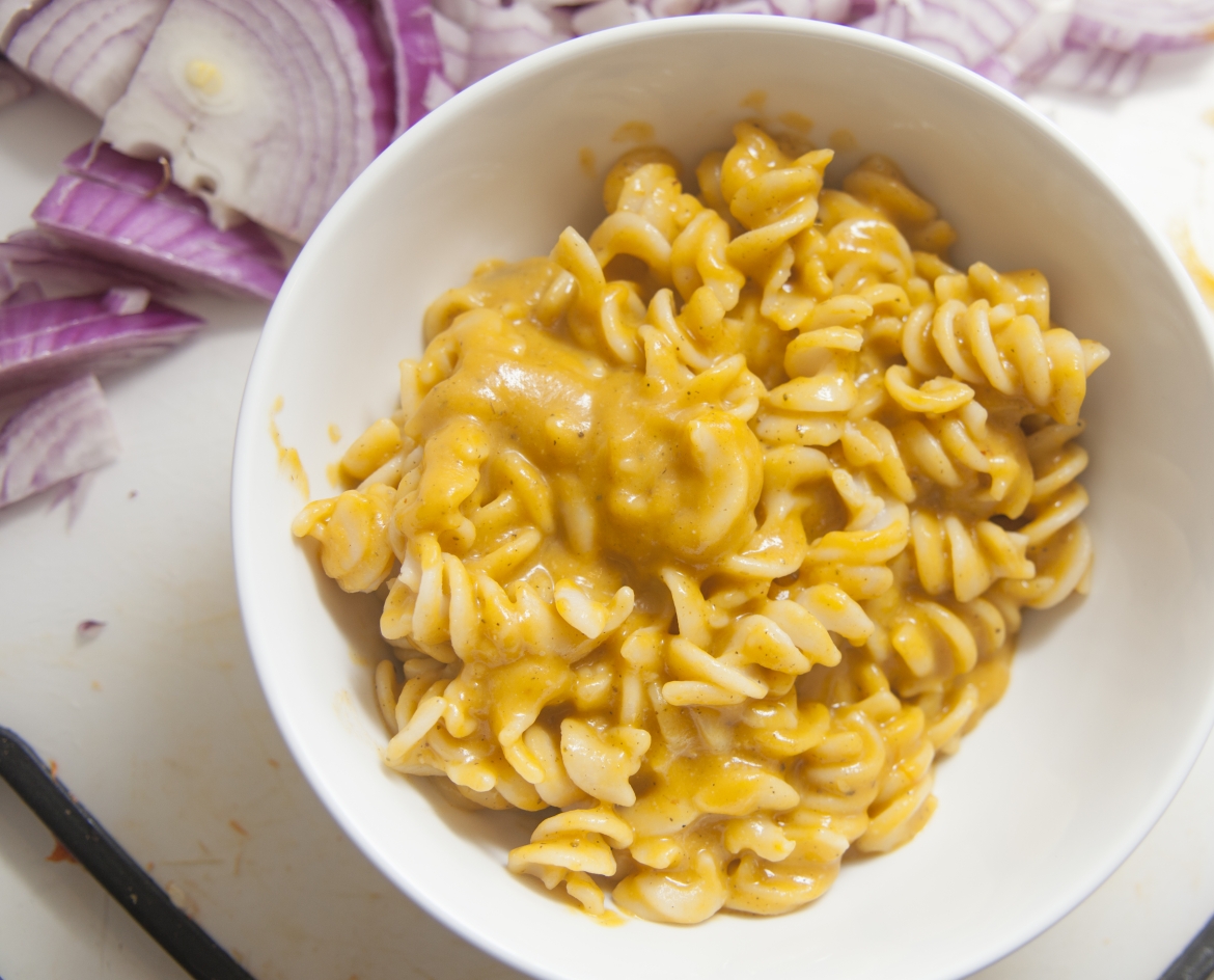 So this is basically a butternut squash mac and cheese, with your choice of noodles. I have seen this done with linguini or elbows, either way sounds good to me. To my surprise this was an effortlessly creamy and thick sauce, and it just so happens to be the perfect color for a mac and cheese sauce too I might add. But for me the best thing about this meal is that it is a very filling comfort food, and I’m all about comfort food:) I have made many alternative cheeses before, once with potatoes, many with cashews (amazing I might add), once with eggplant, and more, but this one stands out to me as the closest I have come to making a substitute cheddar cheese sauce. Now if you absolutely despise squash, know that you will still taste some squash, but it is not overpowering.