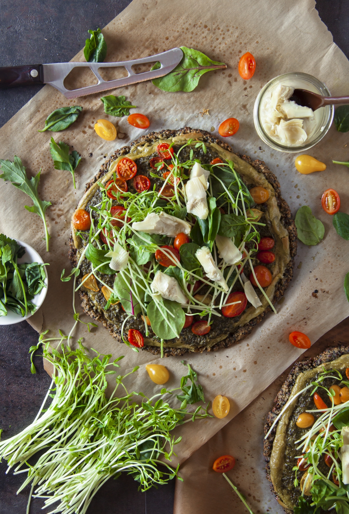 There are lots of ways you can make this, with all different kinds of green leafy vegetables sprinkled on top, or different kinds of sprouts to change up the flavor and crunch. I enjoyed my toppings of sliced baby tomatoes and artichokes, with spinach and alfalfa sprouts placed on after the fact. You could sprinkle different kinds of nuts like sliced almonds, or pine nuts, or different types of olives, maybe even some more vegan cheese if you desired, or just leave it all green and healthy. It is very nutritious for you, as all of the ingredients that go into making this pizza is nutritious for your body in so many different ways.